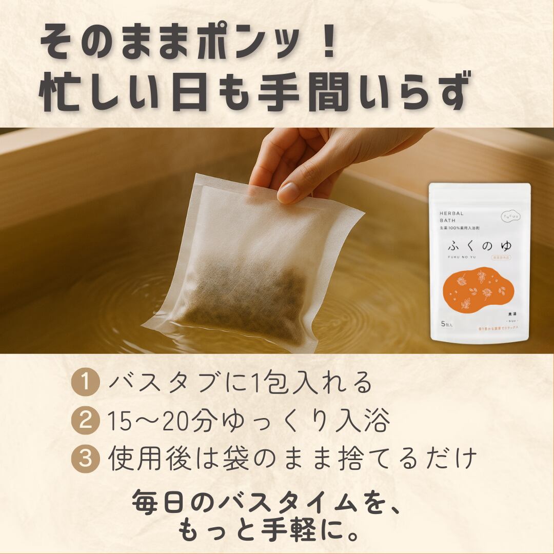 「ふくのゆ ―美湯 biyu―」は、10種類の和漢植物だけを贅沢に詰め込んだ自然派の薬用入浴剤。
