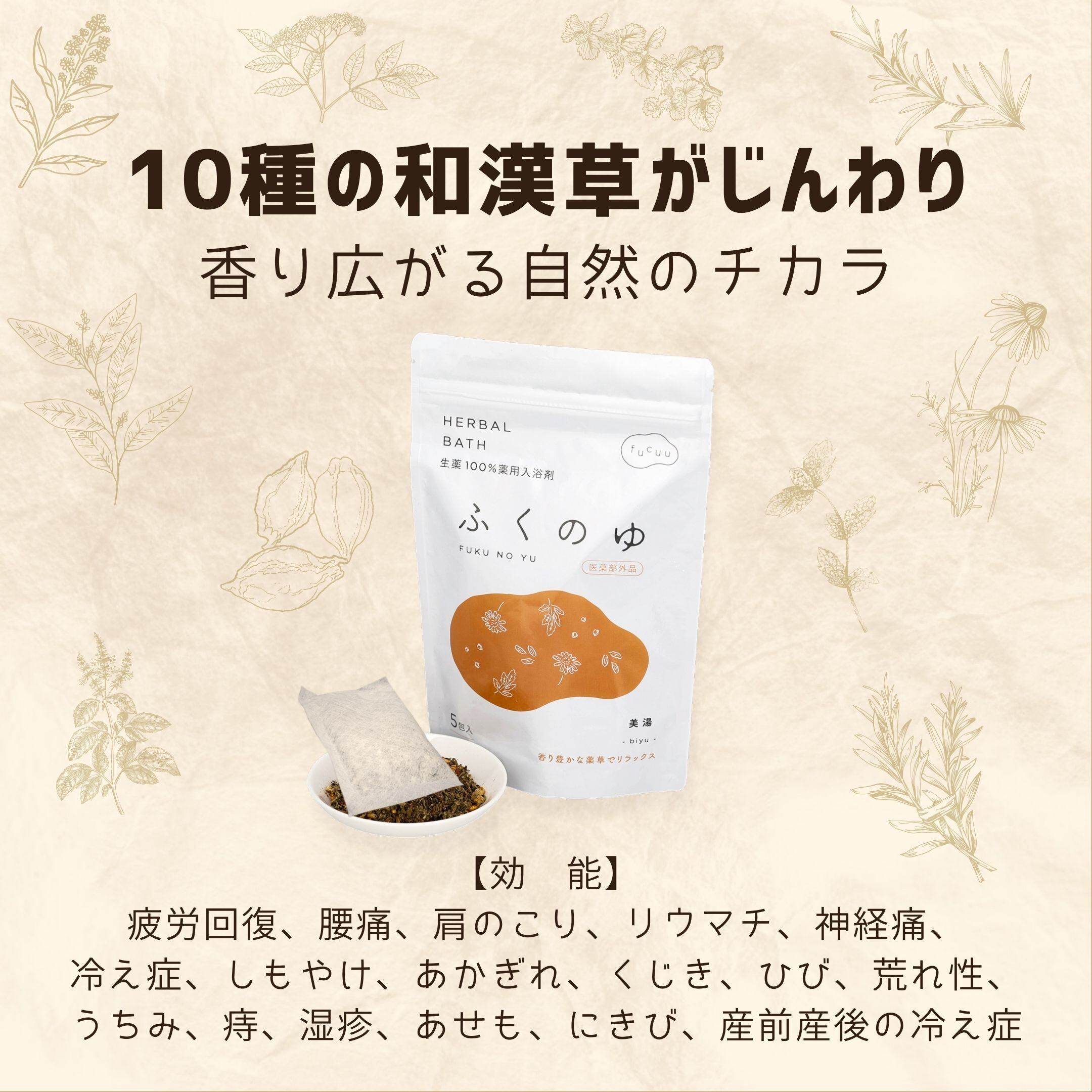 ふくのゆは、10種類の和漢植物を100%使用した自然派の薬用入浴剤。