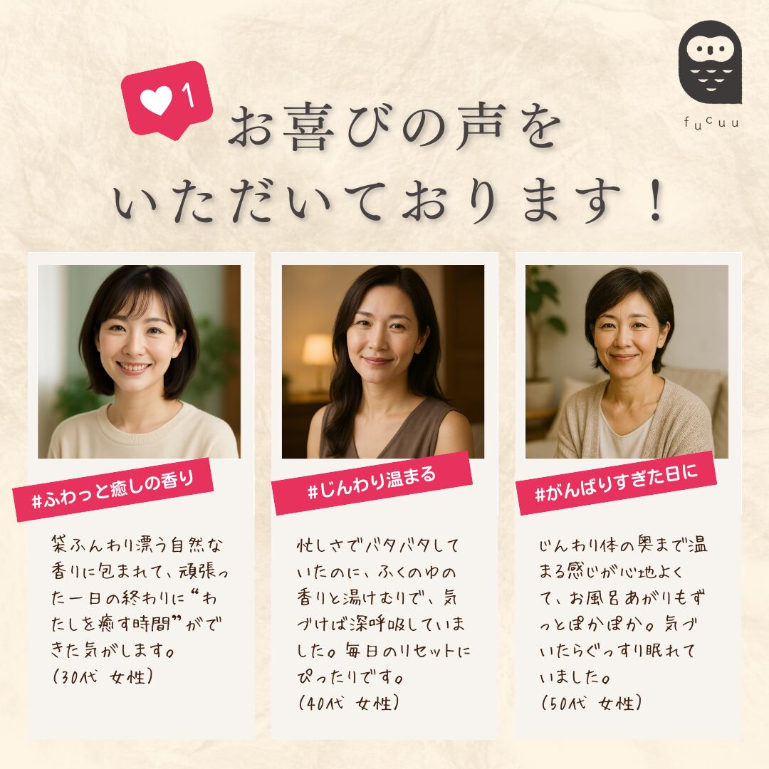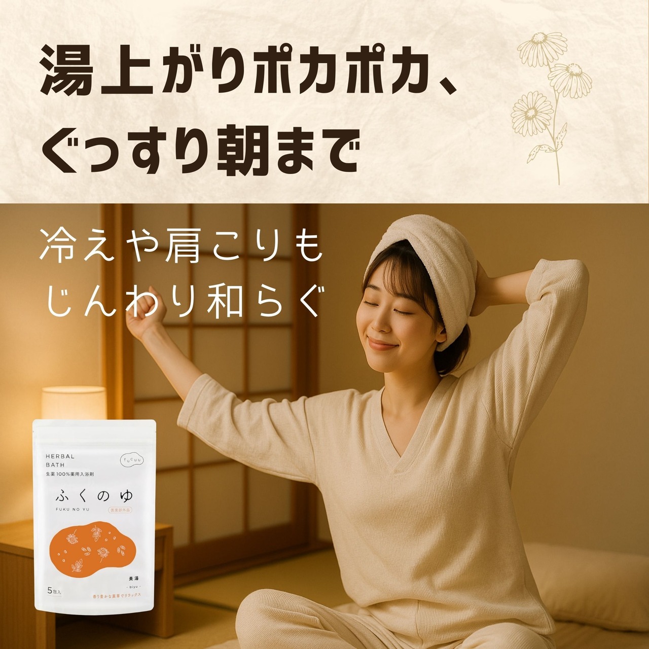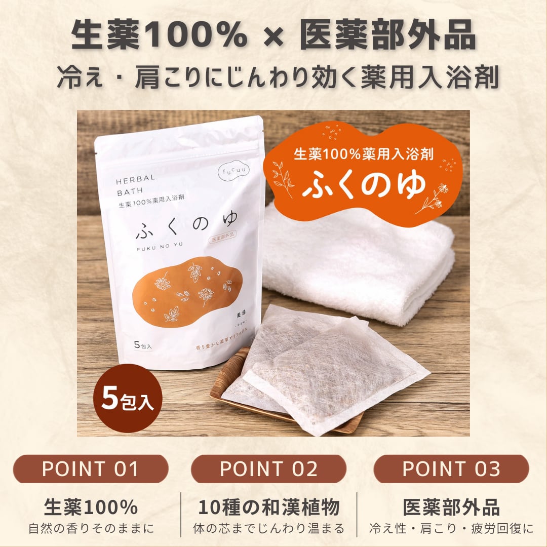 「ふくのゆ ―美湯 biyu―」は、10種類の和漢植物だけを贅沢に詰め込んだ自然派の薬用入浴剤。